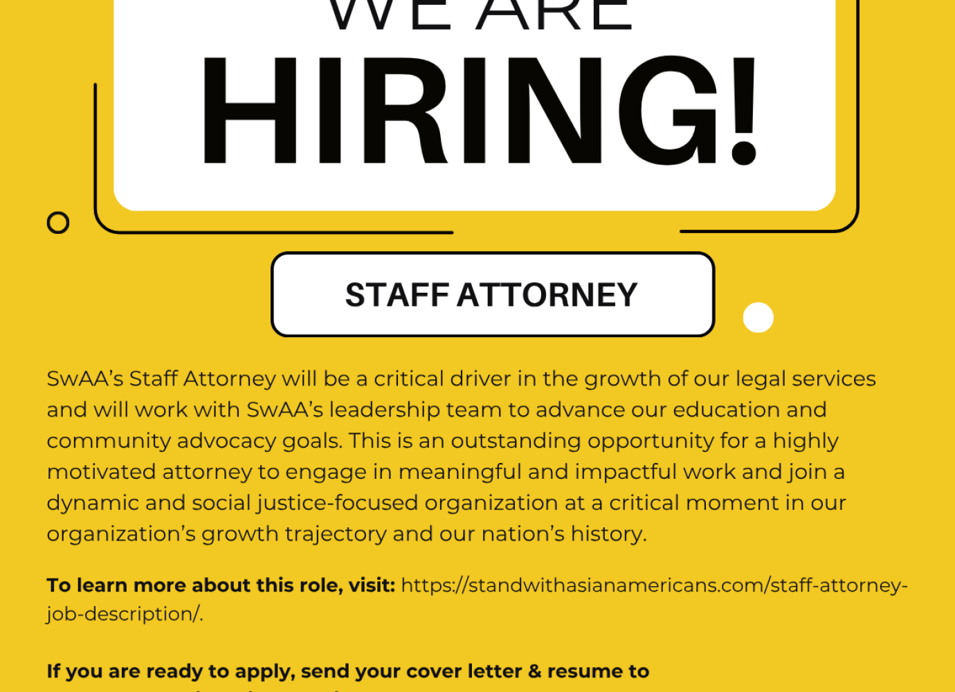 Stand with Asian Americans (SwAA) is hiring a full-time Staff Attorney to grow its legal team.