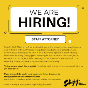 Stand with Asian Americans (SwAA) is hiring a full-time Staff Attorney to grow its legal team.